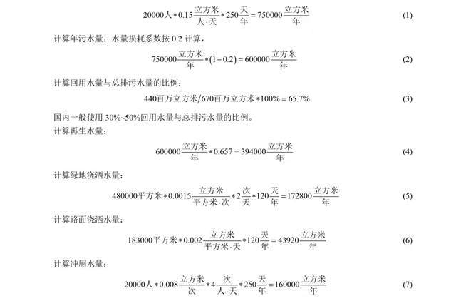 3)西安思源學院不斷踐行低碳節(jié)能環(huán)保,堅持創(chuàng)新,并且在污水處理再生水回用取得很好的成效[13][14][15]。西安思源學院董事會在2000年學校從市區(qū)遷往白鹿塬時就站在保護環(huán)境、走可持續(xù)發(fā)展道路的高度,利用有限的自有資金,建設(shè)生活污水處理站。鋪設(shè)專用2m2范圍內(nèi)的雨水,以及一座1800立方米的游泳池、3座600立方米的景觀噴水池定期換掉的剩水收集管網(wǎng)300多米,大小再生水水庫(包括3座景觀噴水池)5座,擁有各種型號水泵12臺,再生水專用管線25千米。投資一千三百萬完成日處理量為(2000+2000)立方米的mbr膜生物反應(yīng)器的土建基礎(chǔ)設(shè)施,安裝了2000立方米/天的處理設(shè)備并于2011年9月順利投入運行。學校于2019年11月再次投資580萬元對污水處理廠原先預留的2000立方米膜處理設(shè)施進行設(shè)備安裝并投入使用。9年半里mbr膜生物反應(yīng)器已經(jīng)處理670萬立方米的污水,產(chǎn)出440萬立方米符合國家標準再生水并全部回用。西安思源學院現(xiàn)有2萬名師生。用再生水沖廁,澆灌48hm2綠化地,和澆酒18.3hm2路面。除了西安思源學院在污水處理再生水回用取得超出國內(nèi)外許多專家、學者、制造商的預料外,還對所有資金使用、操作程序、運轉(zhuǎn)數(shù)據(jù)都有案可查。可以通過以下的計算,對單位里的污水量、再生水量、再生水回用量做個概算。