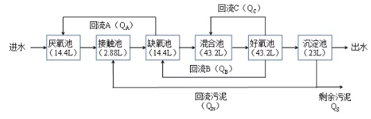 小試裝置為變形uct工藝,由有機玻璃材質制成,長×寬×高為1.44 m×0.3 m×0.3 m,有效容積為120 l,通過擋板分為5個反應區。小試裝置反應區構成及其體積如圖1所示。每個反應池設有攪拌器,在混合池及好氧池底部各均勻布置6個曝氣頭。好氧池末端連接23 l柱狀沉淀池,設計表面負荷為0.64 m3/(m2·h)。為避免藻類滋生對試驗產生影響,整個反應器池體用黑色遮光布進行遮光處理。