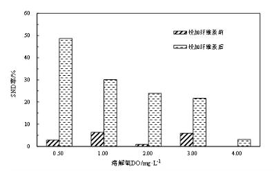 投加纖維素前后的snd效率見圖5,第一階段(未投加纖維素)無論do濃度多大,snd效率均不高(<8%);即使控制do在0.5 mg/l時,snd效率也不過2.8%。相反,第二階段添加纖維素后,snd效率明顯提高,do=0.5 mg/l時達48.69%;即使do提高至3 mg/l,snd效率依然可以保持在20%。這一結果深入揭示了纖維素對絮體致密性產生的絮體內do梯度之重要作用。