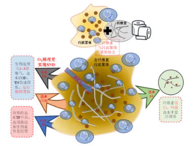 2.3 纖維素對運行的影響纖維素對反應器運行影響是兩方面的,似乎均與其對污泥絮體致密程度有關。圖6總結了纖維素對反應器運行、能耗等方面的影響及其機理。纖維素通過自身線狀形態和官能團可靠網捕卷掃作用將污泥絮體密實包裹,相當于促進絮凝,可降低出水ss以及其中所含n、p。
