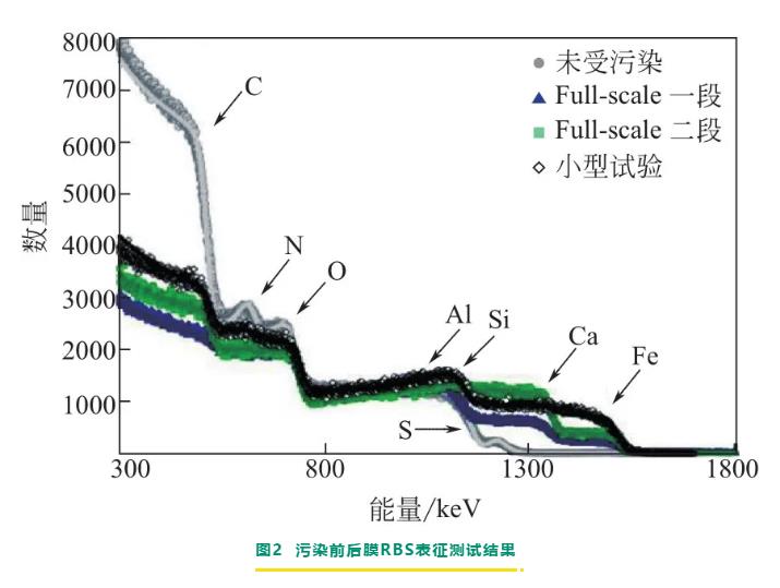 無機污染主要是由水中存在的無機鹽在膜表面逐漸累積,最終形成的無機垢所引起的。無機鹽結垢過程較復雜,常存在多種無機鹽的共沉淀和相互作用。sem、eds、xrd等結構表征和膜表面滴酸測試是常用的無機污染診斷手段。ruiz-garcía等對用于苦咸水脫鹽運行11年的反滲透膜元件進行了剖檢分析,剖檢對象選擇的是四種不同位置的膜元件,分別包含一段和二段反滲透系統的首末支膜。其中一段的第一支膜可以直觀地看到有褐色沉積物,二段的最末支膜可以看到有粗糙的黃色垢,經sem-eds表征及膜表面滴酸分析,得出膜污染物主要是含有碳酸鈣和硅鋁酸鹽的無機污染。xps是常用于表征膜表面元素組成和化學結構的分析手段,但xps只能檢測膜皮層頂端,檢測深度一般只有7nm;rbs也可以用于分析膜表面元素組成和結構,且rbs檢測深度約2μm,比xps能檢測的深度更深,因此rbs還能用于檢測污染層的厚度。gorzalski等利用rbs研究膜表面污染物情況,對用于含硅地下水處理運行2.5年的納濾膜元件進行了剖檢分析,剖檢對象選擇的是一段和二段納濾系統的首末支膜元件。通過sem、xps、rbs等表征分析,得出膜污染物主要是含有fe、ca、si、al、s元素的無機污染,其中一段膜元件的si和al含量較高,二段膜元件的ca污染較重。表2和圖2是rbs對污染前后膜的表征結果對比,由rbs結果可得到xps無法獲得的信息,如不同工段的污染層厚度不同,并且rbs能探測整個污染層,與xps只能探測皮層所得到的si元素含量不同。