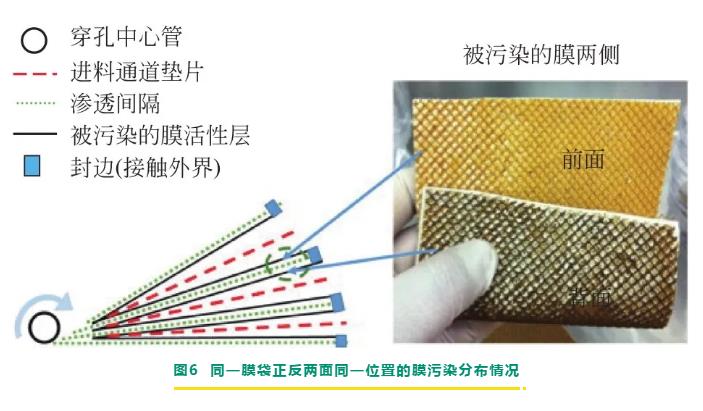 膜解剖是對膜元件進行破壞性拆解后,對膜元件進行相關內部檢測。內部檢測主要包括膜袋、膜卷原水進口端、濃水出口端、濃淡水隔網、膜片表面污染物的檢查。一方面可通過膜袋最外側膜片的折痕判斷產水背壓現象,另一方面通過詳細記錄的污染物顏色、性狀和氣味對膜污染情況進行初判,并對膜樣品和污染物分別進行裁剪和收集,以作后續分析。